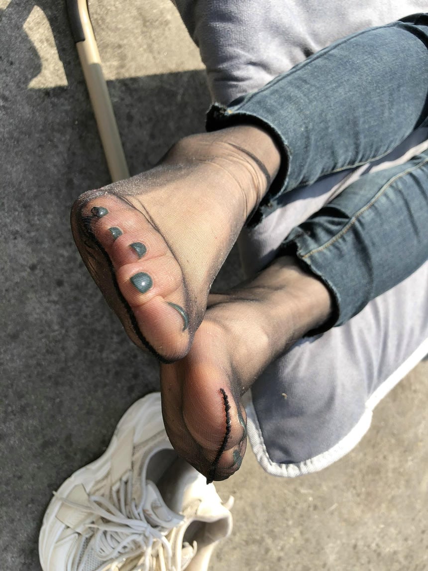 女生与男友一起在公园逛,街拍达人征得双方同意拍下这组黑丝足美脚照,难得