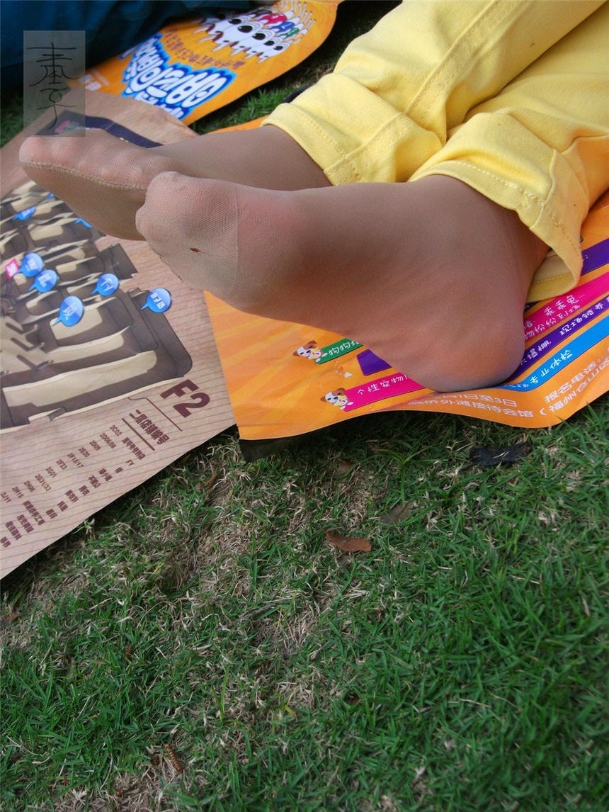 女生与男友一起在公园逛,街拍达人征得双方同意拍下这组黑丝足美脚照,难得